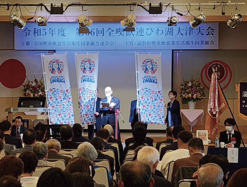 全国の組合員が集まる式典では、大会実行委員長 村井義生氏の開会宣言にて、第66回びわ湖大津大会が盛大に開会されました。開会の辞を全喫飲連副会長 中村重夫氏が述べられ、主催者代表および各都道府県代表の紹介がなされ、歓迎のことばを滋賀県知事 三日月大造氏が挨拶されるなど、大会の華やかさと重要性を感じる時間が続きました。大会会長・全喫飲連会長の田村 眞氏の挨拶の後は、厚生労働省健康・生活衛生局長表彰(7名)/中央会理事長感謝状(4名)/全喫飲連会長表彰(27名)の受賞者が紹介され、滋賀県理事 今村博一氏が代表して謝辞を述べられました。前回大会開催の埼玉県にも感謝状が贈呈され、来賓祝辞・祝電披露と続き、最後には運動方針の発表と大会宣言が力強くなされました。